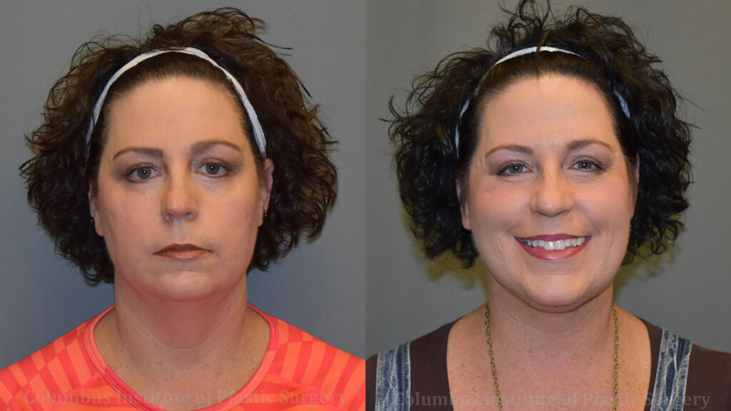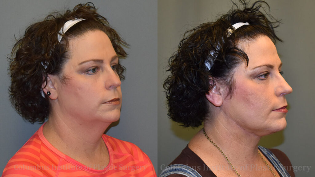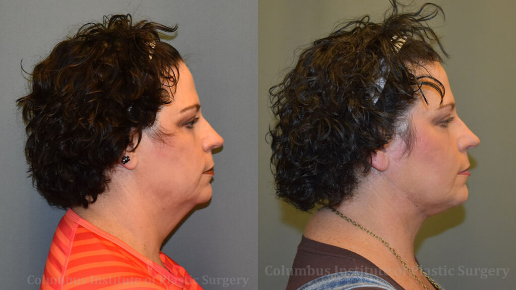 This is a 47-year-old woman from Marion, Ohio who was in search of options for contouring her neckline. She found top plastic surgeon Dr. Bivik Shah here at The Columbus Institute of Plastic Surgery She had a procedure called the Suture Neck Lift. This is a very simple procedure, that is performed awake and recovery is only a few days!!. She looks fantastic, and is enjoying her stunning new neck profile. She is shown here before and just 1 week following surgery.